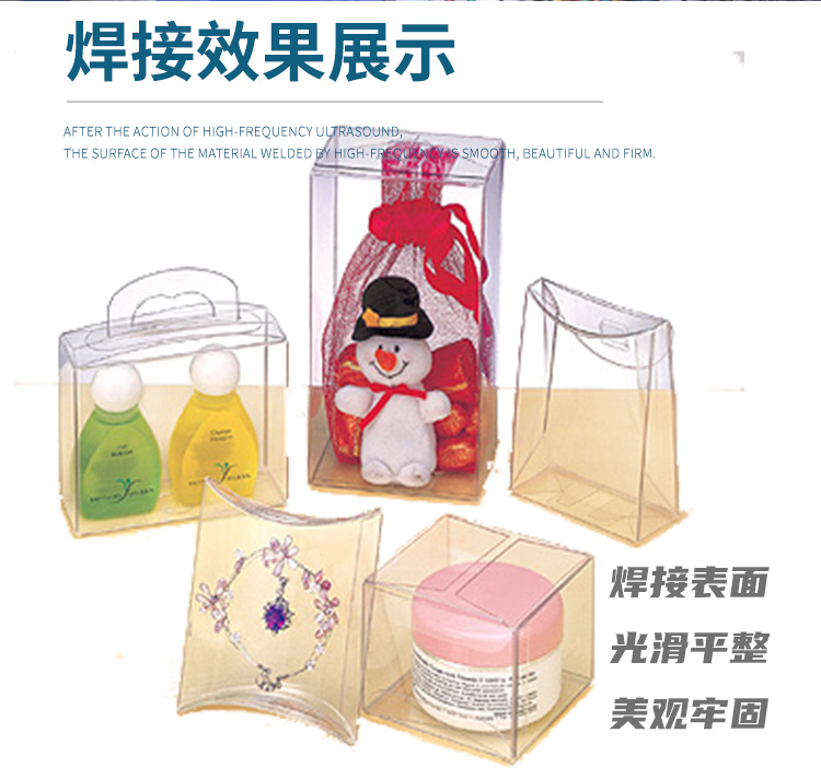 高周波柔軟線膠盒機(jī)適用行業(yè): 柔軟線膠盒成型機(jī)適用于吸塑廠、包裝制品公司、用來專業(yè)制作透明包裝膠盒,也適合較大規(guī)模的廠商自用。如:文具膠盒包裝、化妝品膠盒包裝、禮品膠盒包裝、釣具膠盒包裝、五金工具包裝、糖果點(diǎn)心包裝。