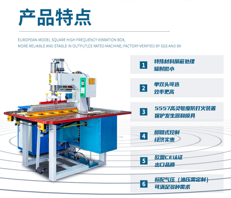 1.高頻熔斷及裁斷可一次完成,節省生產工序。對于普通高頻機只能熔接,無法裁斷的產品,此系列設備均完成。2.本系列機型配備高靈敏度火花保護器,遇到打火狀況,能及時切斷高頻輸出,保護模具產品及設備。