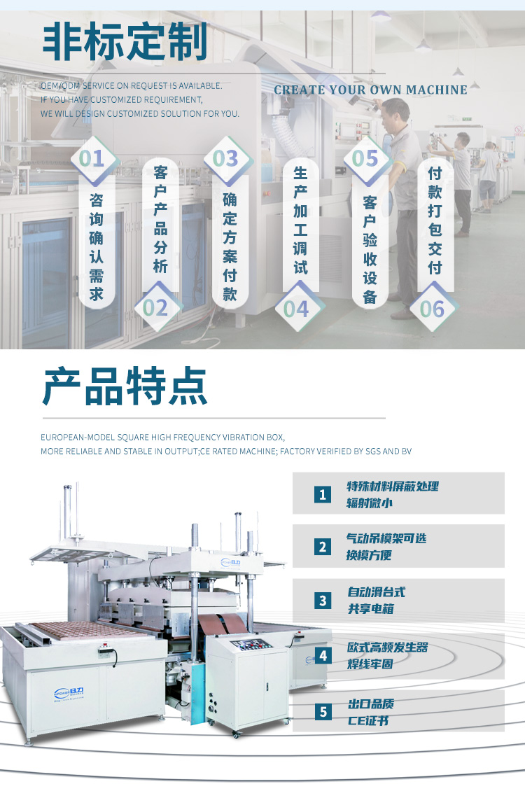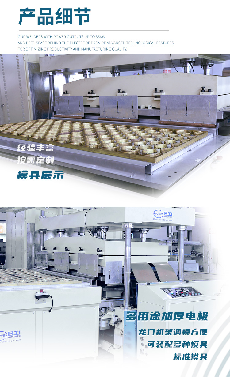高周波水床焊接機(jī)屬于高周波設(shè)備類,它主要是由高周波電子管自激振蕩器產(chǎn)生高頻電磁場,促動有機(jī)分子流動達(dá)到相互滲透熔接的目的。高周波機(jī)的主要工作流程是把被加工對象壓在高頻電磁場的上、下電機(jī)之間,然后利用其內(nèi)部分子被激化而高速運動自身產(chǎn)生熱量而相互流動滲透, 在模具的壓力下達(dá)到熔接或壓花的目的。主要用于PVC水床等大型產(chǎn)品的單邊焊接。 高周波水床焊接機(jī)結(jié)構(gòu)組成與特點: 一、周率穩(wěn)定,高周波機(jī)械采用真空電子管 , 輸出功率穩(wěn)定 , 振蕩周率采用國際工業(yè)波段 27.12MHz ,符合國際標(biāo)準(zhǔn); 二、采用強(qiáng)力式機(jī)頭,壓力輕重可任意調(diào)節(jié),設(shè)計利用肘節(jié)推動杠桿原理,能使壓力均勻,上落平穩(wěn),以配合不同熔接深淺度的需要,特別適合用于難對位產(chǎn)品。 三、避免電波干擾裝置:設(shè)有高周波頻率穩(wěn)定器及高周波屏蔽裝置,將高頻干擾降低。 四、輸出力強(qiáng):采用低損耗的同軸諧振器,能使制品熔接,大大提高生產(chǎn)量。 五、過流保護(hù)系統(tǒng):自動過流保護(hù)系統(tǒng),可增加真空電子管使用壽命 , 保護(hù)模具。 六、加熱裝置:無級加熱調(diào)溫裝置 , 可依不同產(chǎn)品的生產(chǎn)需要 , 可調(diào)整溫度 , 讓工作效率更高。 七、安全保護(hù)裝置:工作中當(dāng)電流負(fù)荷超過限制值時,過荷電流繼電器會自動切斷高壓,保護(hù)振蕩管及整流器;此外,本機(jī)備有高靈敏度的火花抑制器,同時可以避免由不當(dāng)操作所引起的頻率漂移。 高周波水床焊接機(jī)的技術(shù)規(guī)格: 機(jī) 型: HR-25KW HR-35KW 高周波 功率: 25000W 35000W 電 源 電 壓: 380V 50/60Hz 頻 率: 13.56MHz 輸 入 功 率: 35KVA 50KVA 整 流 器: 矽二極體 振 蕩 器: 8T25RA 8T877RB 最 大 壓 力: 1500kg 2000kg 電 極 間 隔: 150MM 活 動 尺 寸: 150MM 上電極 尺寸: 200*2100mm 200*2500mm 下電極 尺寸: 300*2200mm 300*2600mm 熔 接 時 間: 0-10S可調(diào) 產(chǎn) 能: ㄑ2500次/8H 加壓 方 式: 氣壓驅(qū)動
