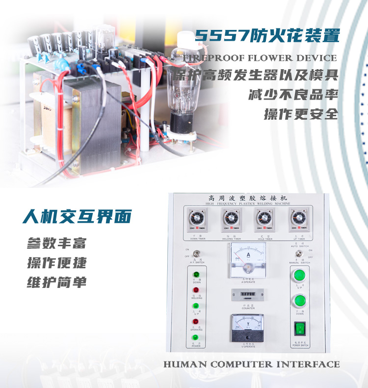 | 機器特點: | 操作非常簡便、快捷易于上手,生產的產品外觀精美,效率高。本機設有高靈敏度火花抑制電路,能準確檢出產生火花的不平衡電流,于產生火花瞬間迅速切斷振蕩回路抑制火花,使模具、原料及產品的損害降到最低程度。 |