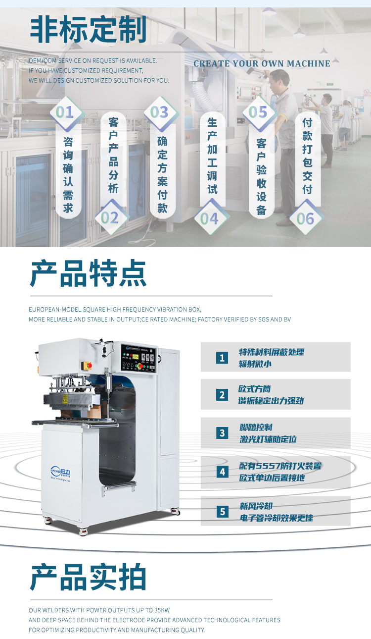 | 機器特點: | 5KW行業入門級機器;腳踏控制 該機器主要采用高壓變壓器整流自激高頻電子管振蕩瞬間產生高頻電磁波電場,利用被加工的PVC、TPU、等塑膠、塑料原材料在高頻電磁波電場內其被焊接塑膠、塑料材料的內部分子產生極性化生熱,加上一定的壓力使所需要熱合焊接的塑料、塑膠產品達到熔接封口作用,機器結構和模具等可根據客戶要求做調… |