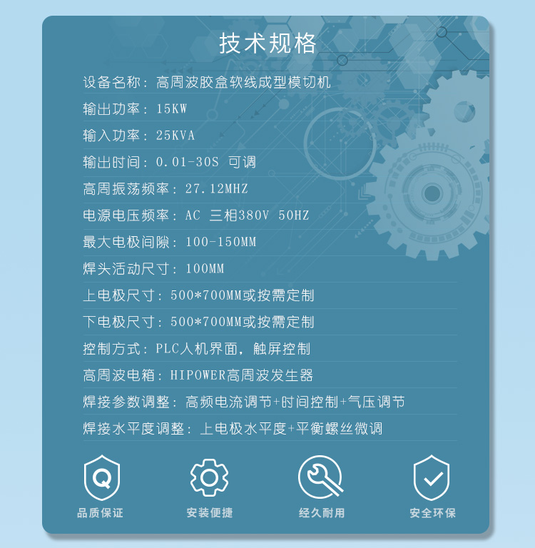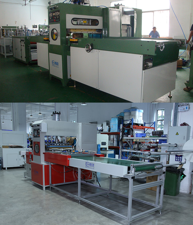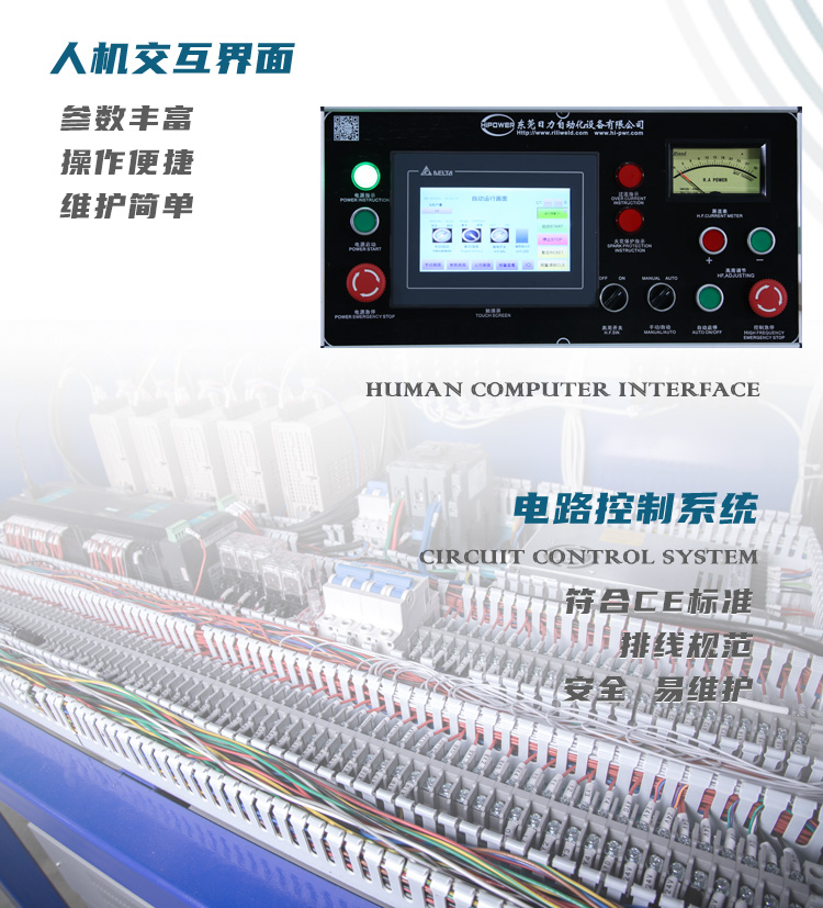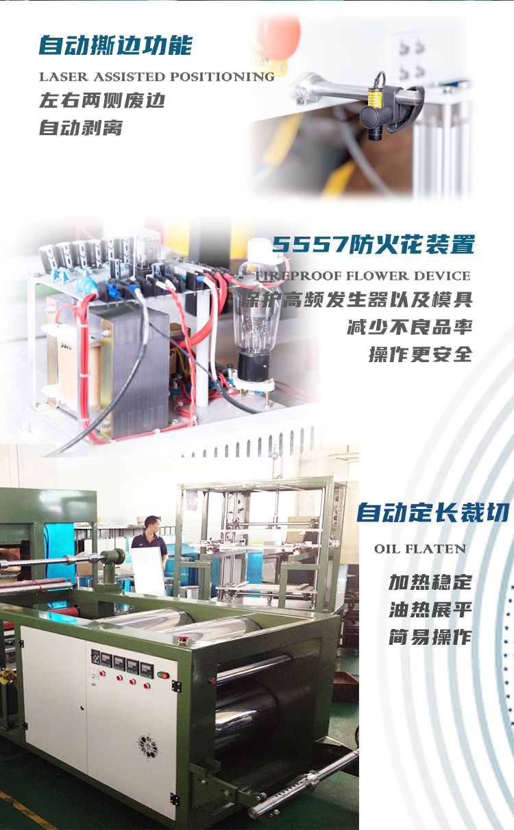 環(huán)保料高周波柔軟線膠盒機(jī)的用途: 最適用于APET、PETG、GAG等環(huán)保料柔軟線膠盒制作.也可用于需要高周波熔接同時又必須同步裁斷的產(chǎn)品加工.工作原理是利用高周波先熔接,再通過機(jī)器配有的壓力裝置同時切斷,基本上是同時完成.故稱高周波同步熔斷機(jī),也稱為高周波熔斷機(jī)、熔斷機(jī)、高周波同步裁斷機(jī)、高周波裁斷機(jī)。也可用于APET、PETG、GAG環(huán)保材質(zhì)的雙面吸塑泡殼的封口包裝、吸塑紙卡包裝、牙刷封口包裝,以EVA布類皮革、真皮、OPP、PU材質(zhì)的熔接并熔斷。一切需熔接且同時裁切之材料,均可加工。 環(huán)保料高周波柔軟線膠盒機(jī)的特點(diǎn): ■ 純油壓式壓力,出力更穩(wěn)定,左右雙向自動滑臺,往返連續(xù)推送模具,定位精準(zhǔn)±20um。 ■ 裁斷壓力1-30噸可調(diào),出力穩(wěn)定可靠,結(jié)構(gòu)剛強(qiáng)。 ■ 采用高靈敏度PL5557火花防止器,有效防止損壞模具. ■ 加壓方式:純油壓式兩段壓力,無需氣源。 技術(shù)規(guī)格; 機(jī) 型 HR-15KW-30T HR-25KWP-40T 高周波 功率 15000W 25000W 電 源 電 壓 380V 50/60Hz 頻 率 13.56MHz 輸 入 功 率 25KVA 35KVA 整 流 器 SILICON DIODE 矽二極體 振 蕩 器 7T85RB 8T25RA 最 大 壓 力 30T 40T 電 極 間 隔 150MM 焊頭活動尺寸 150MM 上電極 尺寸 700*800mm 800*900mm 下電極 尺寸 700*800mm 800*900mm 溫 度 范 圍 30-200℃可調(diào)Adjustable 熔 接 時 間 0-10S可調(diào)Adjustable 產(chǎn) 能 ㄑ35000times/8H <機(jī)器相關(guān)所有尺寸,均可根據(jù)用戶要求定制。因改良需要,規(guī)格變動不另通知> |