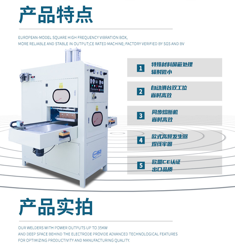 ★自動滑臺式高周波同步熔斷機振蕩頻率符合國際工業波段標準,由高Q值真空電子管自激振蕩器產生高頻電磁場,使加工塑膠在上下電極間的高頻電場內,使其分子產生劇烈運動摩擦,在模具的壓力下得到其熔接效果。高周波熔斷機采用H型龍門結構,左右雙向自動滑臺,往返連續推送模具,運行高效。