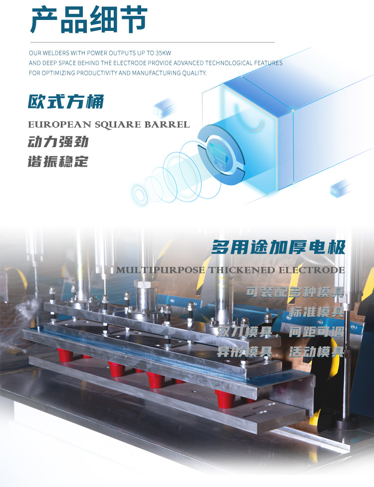 機器可連續壓線接熔,接熔長度可以自由定制。歐洲制式方形高頻震蕩箱,出力更大,更加穩定。機器為C型結構,機身