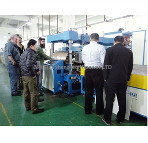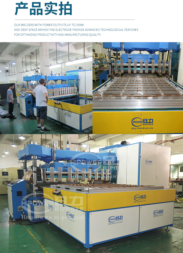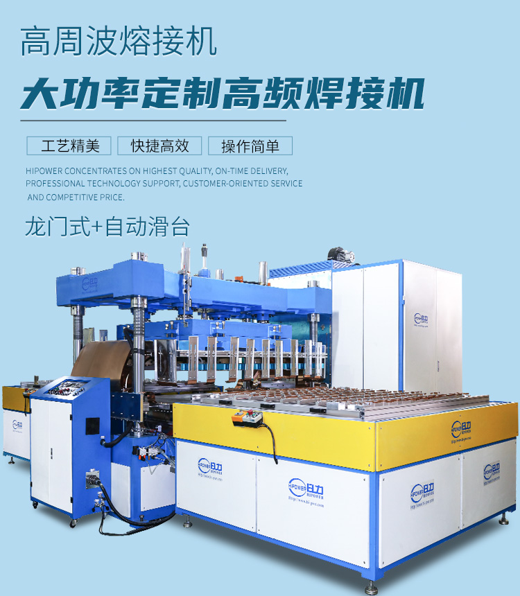 由高周波系統(tǒng)、(含高周波電箱、高周波控制配電箱、滑臺(tái)緩沖控制、高周波龍門式四柱機(jī)架結(jié)構(gòu)) 滑臺(tái)式工作臺(tái)系統(tǒng)、高周波防護(hù)系統(tǒng)、高周波油壓驅(qū)動(dòng)系統(tǒng),獨(dú)立的水冷系統(tǒng)等結(jié)構(gòu)組成。本設(shè)備是一套自動(dòng)高周波焊接裝置,在滑臺(tái)式工作臺(tái)手工放入工件,由手工定位,設(shè)備將工件自動(dòng)送至高周波工作區(qū)域進(jìn)行高周波焊接;完成焊接的產(chǎn)品經(jīng)滑臺(tái)式工作臺(tái)退回后取出。從而完成一個(gè)完整的流程;作業(yè)員按設(shè)備設(shè)定的節(jié)拍持續(xù)置入產(chǎn)品原料,高周波作業(yè)節(jié)拍高效率地自動(dòng)化完成熔接作業(yè)。用戶可自由設(shè)置作業(yè)時(shí)間,一般為10--15秒一個(gè)作業(yè)節(jié)拍。