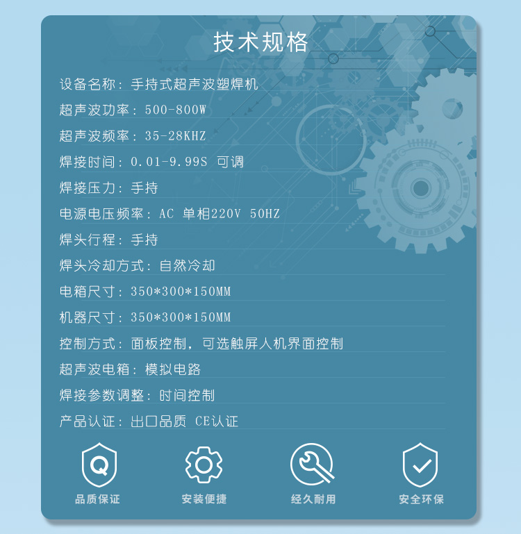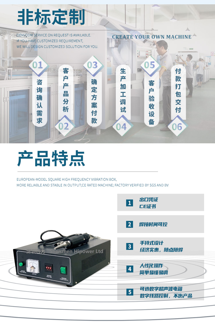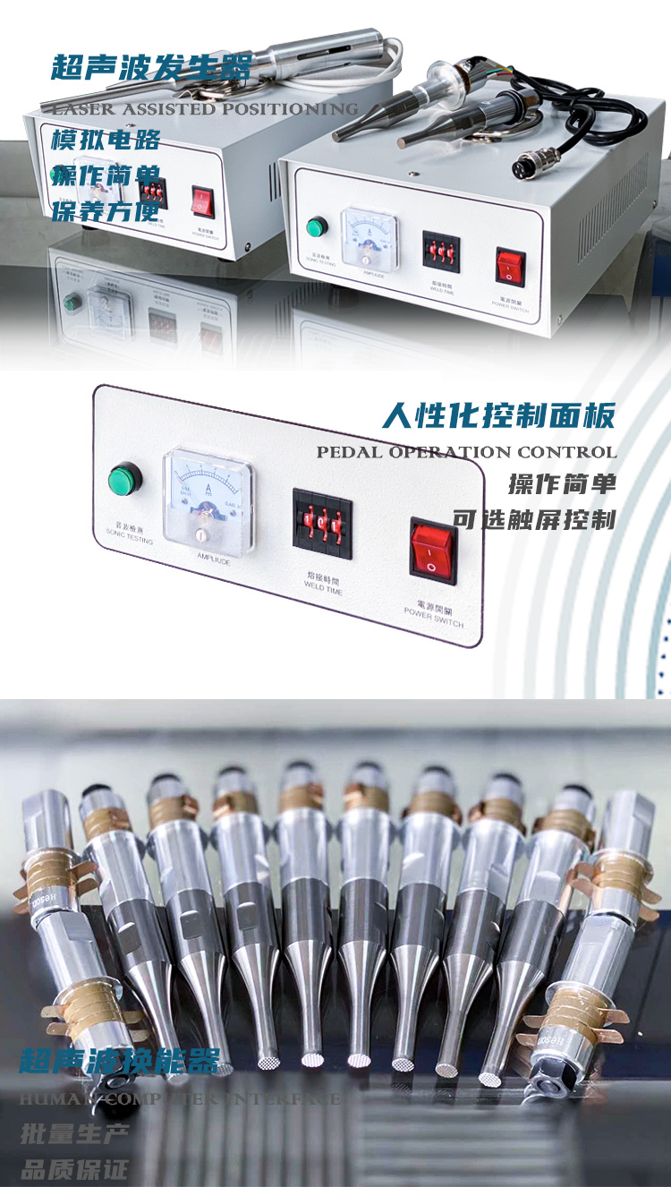 超聲波發生器(電箱): 采用美式數字線路,微電腦屏幕,人性化操作,簡單易懂易調,精確的時間控制,可以1ms遞增減,