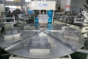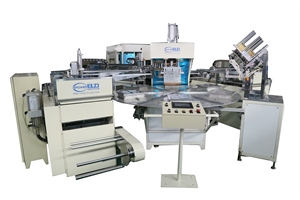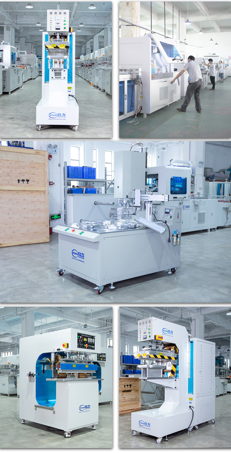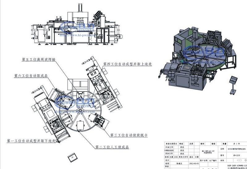 本設備是由深圳日力公司自主開發研制的一套自動高周波吸塑包裝的熔接作業設備,本設備工序流程如下: 第1個工位底蓋吸塑成型裁切并自動放入轉盤模具內、 第2個工位由人工(或機械手)放被包裝物, 第3個工位由機械手自動放入紙卡到模具, 第4個工位上泡殼吸塑自動吸塑成型裁切并自動放入模具, 第5個工位高周波進行自動熔接裁切處理,