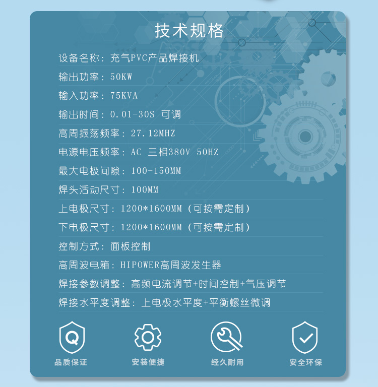 | 適用范圍: | 大型高周波熔接機專用焊接熱合其他行業類的高周波熔接:救生衣、漂流艇、漂流船、浮排、窗簾、浴簾、充氣水池、游泳池、保健床墊、玉石床墊、充氣床墊、吹氣沙發等 |