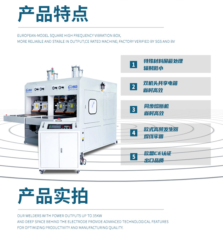 ★高周波熔接機(jī),通常也稱為高周波吸塑包裝機(jī)、高周波塑料熔接機(jī)、高頻熱合機(jī)、高頻封口機(jī)、吸塑包裝機(jī)、高周波封口包裝機(jī)、熱合封口包裝、泡殼包裝機(jī)、高頻熱合包裝機(jī)、吸塑包裝機(jī)、高周波封口機(jī)、高頻包裝機(jī)、高周波包裝機(jī)、包裝機(jī)械等等。單頭推盤(pán)式高周波熔接機(jī)和單頭轉(zhuǎn)盤(pán)式高周波熔接機(jī)有手動(dòng)和自動(dòng)兩種可供選擇,自動(dòng)推盤(pán)式或自動(dòng)轉(zhuǎn)盤(pán)式的高周波機(jī)效率更高,產(chǎn)量更好。自動(dòng)滑臺(tái)式高周波熔接機(jī)為雙向自動(dòng)滑臺(tái),往返式連續(xù)送料熔接,定位精準(zhǔn)。也適用用大面積產(chǎn)品的加工,熔接,如PVC水床,漂流筏,兒童泳池等。